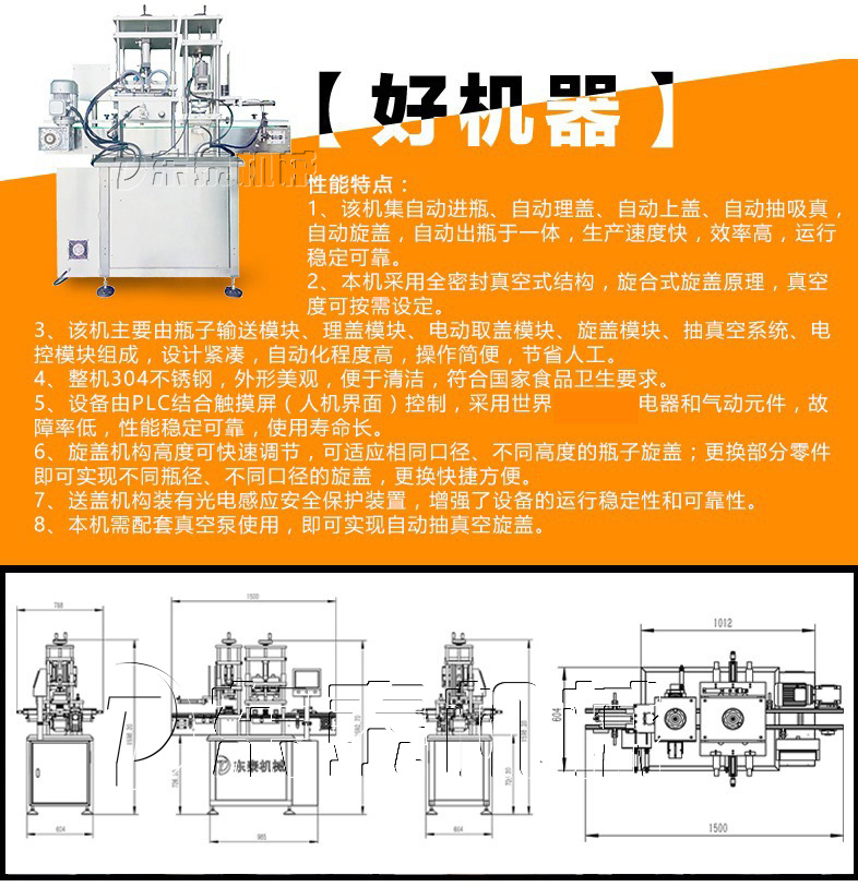 1.該機(jī)集自動進(jìn)瓶、自動理瓶、自動上蓋、自動抽真空、自動旋蓋、自動出瓶于一體,生產(chǎn)速度快,效率高,運(yùn)行穩(wěn)定可靠。