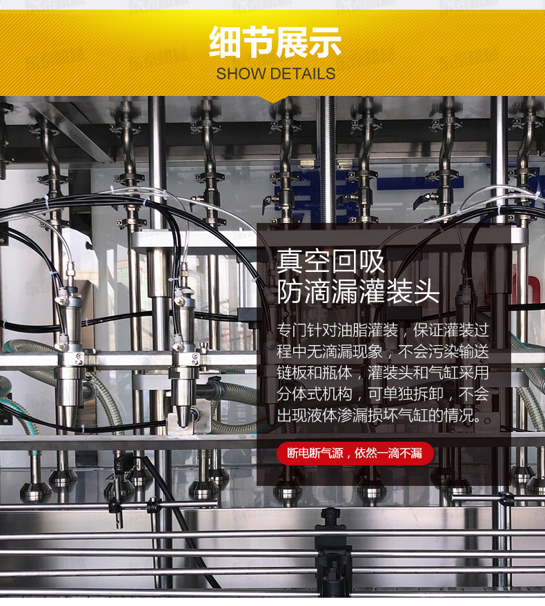 2、設(shè)計及真空回吸系統(tǒng)保證灌裝過程中無滴漏現(xiàn)象,不會污染輸送鏈板和瓶體。灌裝頭和氣缸采用分體式機構(gòu),可單獨拆卸,不會出現(xiàn)液體滲漏損壞氣缸的情況。亞德客氣缸經(jīng)久耐用,其他密封等配件使用標(biāo)準(zhǔn)件,更換維護簡單方便。