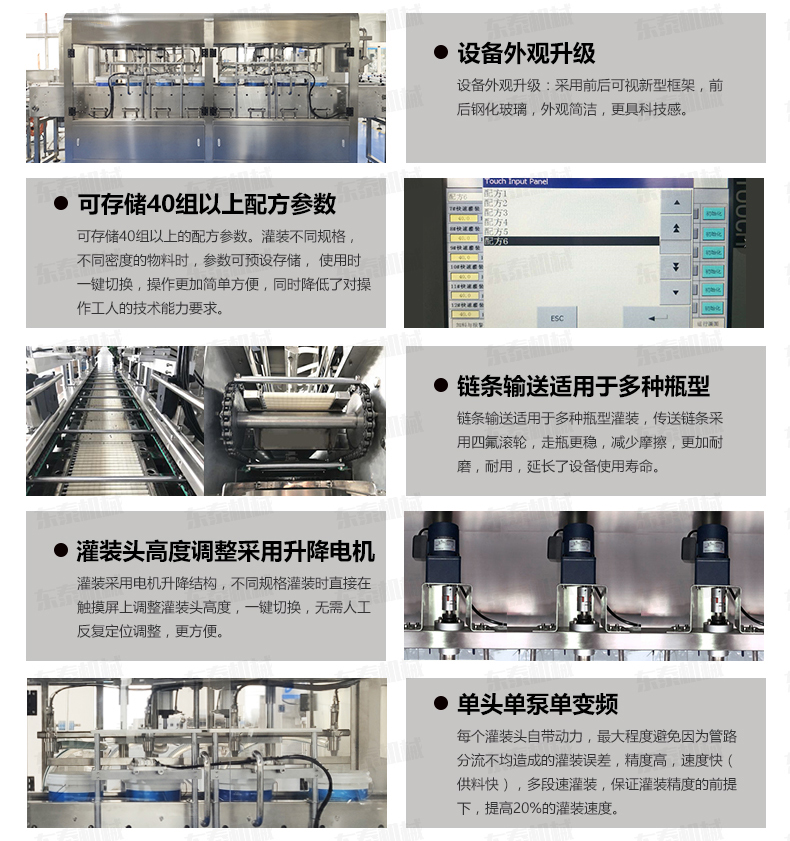 3、摒棄了傳統(tǒng)夾瓶口灌裝方式,采用下潛式灌裝專利下料口設(shè)計,邊灌邊提,避免了灌裝速度快產(chǎn)生細小水珠噴濺污染瓶口的現(xiàn)象產(chǎn)生。配合多段式快慢速灌裝,可以保障高速灌裝時全速灌裝,又可有效解決氣壓過高快速灌裝時泡沫溢瓶現(xiàn)象,變頻控制更精確,自我保護更安全,穩(wěn)定,延長設(shè)備使用壽命。